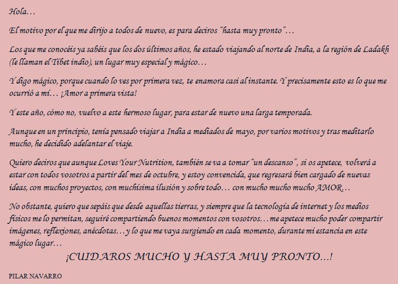 LOVES YOUR NUTRITION Hasta muy pronto… Fecha: 23 febrero, 2014Autor/a: Pilar Navarro 0 Comentarios Ladakh…gracias gracias gracias por todo lo que das En Ladakh… Comparte esto: Comparte en Facebook (Se abre en una ventana nueva) Facebook Enviar un enlace a un amigo por correo electrónico (Se abre en una ventana nueva) Correo electrónico Me gusta Cargando... Relacionado