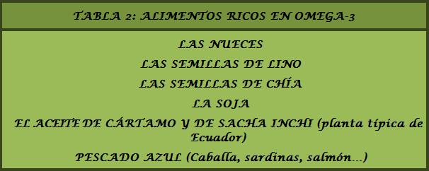 9- Aumenta el consumo de alimentos ricos en ácidos grasos W-3 (ver tabla 2): disminuyen el nivel de colesterol sanguíneo y evitan la formación de trombos.
